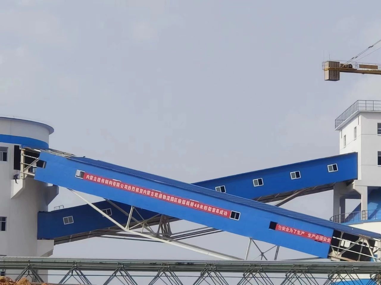 2024年5月20日下午 15 點 26 分由山西開源益通礦業科技工程有限公司承建的1號轉載點到1號產品倉帶式輸送機鋼結構棧橋順利完成吊裝工作。