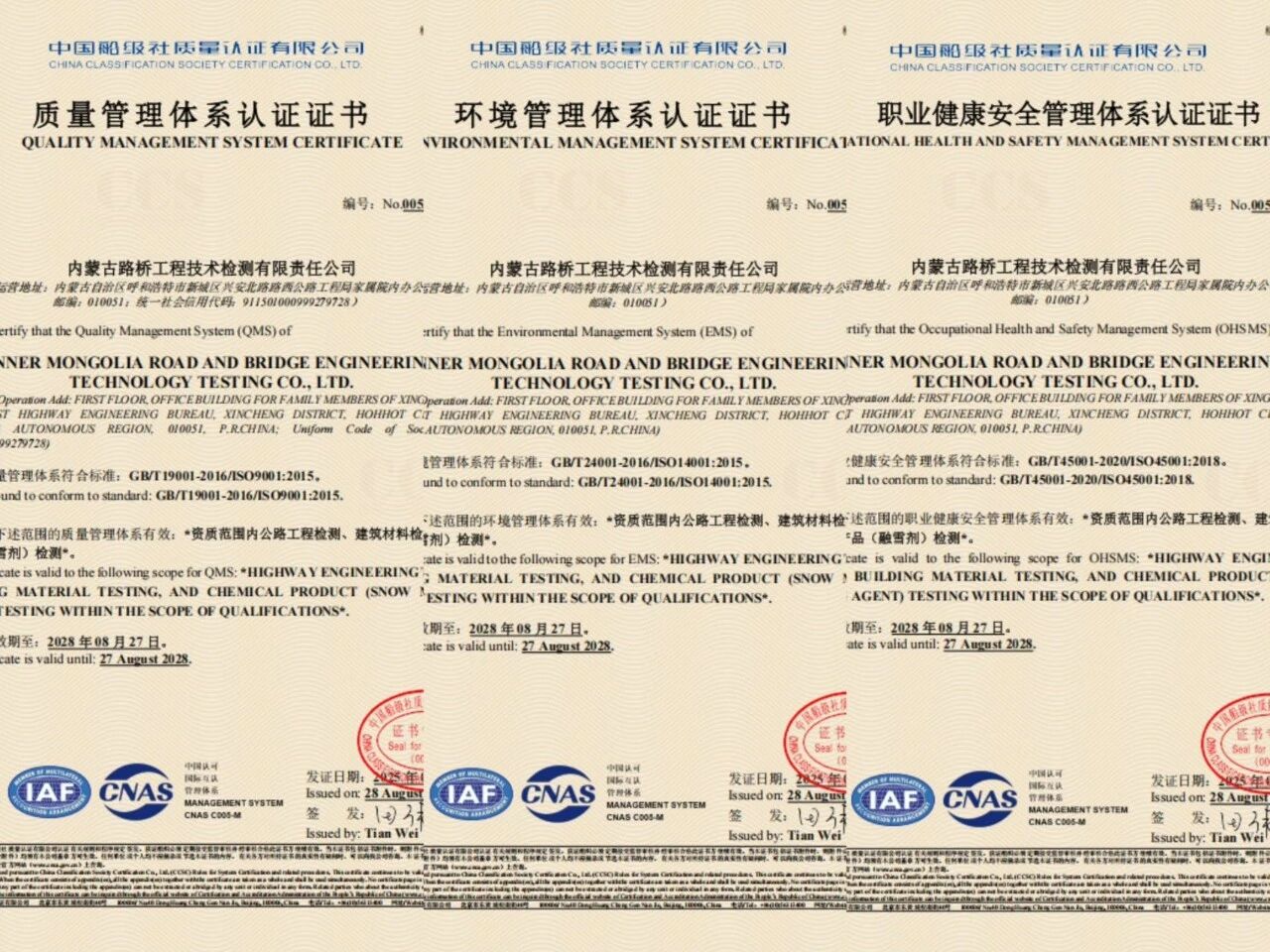 近日,經過權威認證機構的嚴格審核,內蒙古路橋工程技術檢測有限責任公司(簡稱“檢測公司”)成功獲批質量管理體系、環境管理體系和職業健康安全管理體系(簡稱“ISO三體系”)認證證書,標志著企業標準化、規范化、精細化管理邁進新篇章。